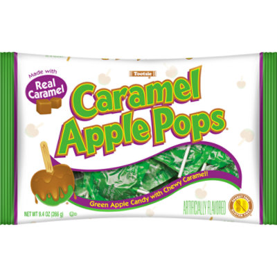 Caramel apple pops are a brand of lollipops manufactured by tootsie roll industries the lollipops combine a green apple flavored hard candy covered with a caramel coating reminiscent of a caramel apple there are two additional flavors available seasonally in the autumn.